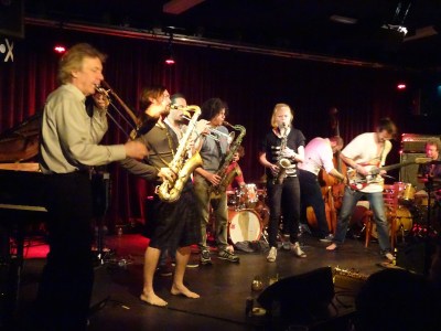 Uitgezonderd de afsluitende zondag vindt op iedere dag van Incubate een optreden plaats van Jasper Stadhouders’ International Improv Ensemble. Dat betekent zes avonden op rij vijfenzeventig minuten lang een volledig geïmproviseerde set, gespeeld door muzikanten uit verschillende landen die door Stadhouders zijn uitgenodigd. Vanavond vindt dus de laatste sessie plaats en het tiental improvisatoren vertoont geen spoortje van moeheid. Ieder van de muzikanten pakt zijn of haar moment om als solist te schitteren en daarom is het noodzakelijk om de hele tienkoppige bezetting te noemen: Luis Vicente (Portugal) – trompet, Mette Rasmussen (Denemarken) – altsaxofoon, Edoardo Marraffa (Italië) – tenor- en sopraninosaxofoon, John Dikeman (USA) – tenorsaxofoon, Johannes Bauer (Duitsland) – trombone, Leo Svirsky (USA) – piano en accordeon, Jasper Stadhouders (Nederland) – gitaar, Peter Ajtaj (Hongarije) – bas, Onno Govaert (Nederland) – drums en Steve Heather (Australië) – drums. Het ensemble herbergt de volledige bezetting van het onvolprezen Cactus Truck, wat niet verwonderlijk is omdat Stadhouders hier zelf deel van uitmaakt. De vijf op vol volume door elkaar heen toeterende blazers zorgen voor een kakofonie van geluid die regelmatig terugkeert. Tussendoor vinden de muzikanten elkaar in kleinere bezettingen of wordt gesoleerd. De mooiste solo komt op naam van Marraffa op sopraninosax en de leukste op naam van Rasmussen, die een enthousiaste schreeuw vanuit het publiek tijdens een van haar solo’s beantwoordt met eenzelfde schreeuw. In het overwegend jonge gezelschap is voorts de 61-jarige nestor Bauer een opvallende verschijning. Hij doet in begeestering niets onder voor zijn jongere collega’s. Met een lange, zachte trompetklank van Vicente komt een einde aan een lange en uitputtende maar indrukwekkende groepsimprovisatie. Maar wat wil je met zo’n topbezetting?