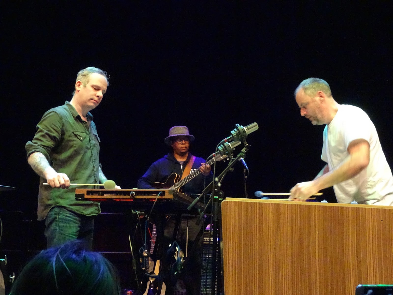 De goed gevulde zaal is van meet af aan enthousiast, maar het concert komt toch een beetje traag op gang. De inventieve muziek van Tortoise moet het hebben van puur muzikantenschap en niet van emotie. Risico is dan dat het geheel een beetje voortkabbelt. In het eerste kwartier van het optreden is dat aan de hand. De muzikanten doen geconcentreerd hun ding, wisselen na elk nummer van instrument en maken vooralsnog geen contact met het publiek. Drums en vibrafoons staan voor op het podium opgesteld, waardoor op het moment dat de vibrafoons niet gebruikt worden vier van de vijf bandleden achter op het podium staan opgesteld.