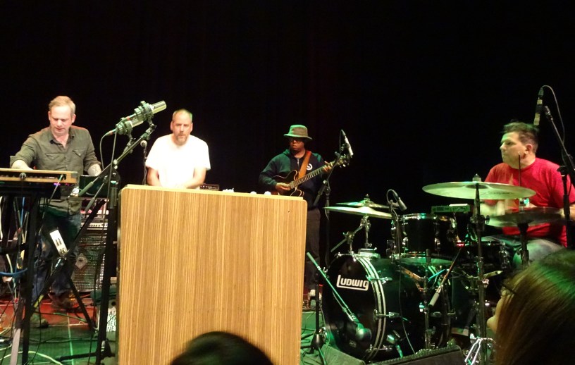 De tweede opwarmer voor Tortoise overtuigt veel meer. Sam Prekop is het meest bekend als zanger/gitarist van The Sea And The Cake, maar vanavond staat van hem een dj-set aangekondigd. Dat houdt in dat Prekop een dik half uur lang met elektronica in de weer is. Aan de zijkant van het podium staat die elektronica voornamelijk verticaal opgesteld en Prekop zit daarachter, blikje Jupiler (waar hij overigens niet uit drinkt) bij de hand. Visueel valt er weinig te beleven: Prekop draait aan knopjes, plugt her en der een stekkertje in of uit en that’s it.