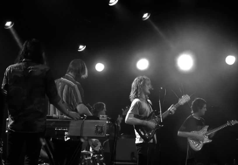Waar The Super Soakers niet veel tijd verspillen tussen de nummers door, verspillen King Gizzard and the Lizard Wizard in het geheel geen tijd, want de songs lopen in elkaar over, waarbij die songs regelmatig wel wat kunstmatig aan elkaar worden geplakt, bijvoorbeeld door slechts de drums door te laten spelen voordat het volgende nummer wordt ingezet. Die drums wordt door twee simultaan spelende slagwerkers verzorgd, wat een mooi gezicht is. Frontman Stu MacKenzie speelt gitaar en zingt, maar speelt ook dwarsfluit. Naast MacKenzie telt de band nog twee gitaristen, maar van een dichtgeplamuurd geluid is gelukkig geen sprake. Sterker nog: de gitaren zijn goed van elkaar te onderscheiden, want het geluid in het nieuwe Doornroosje is erg goed.