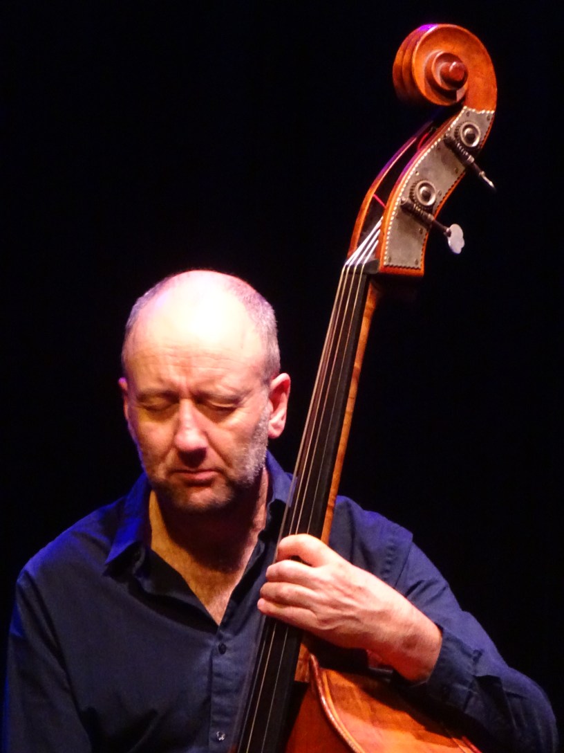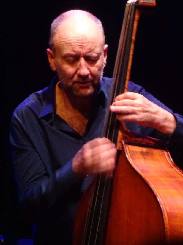 Buck is bij aanvang in de weer met belletjes, die overigens niet zichtbaar zijn omdat ze schuilgaan achter de drumkit, en beslaat stick van zijn mallet de rand van de zware tom. Later bespeelt de drummer vooral de hihat, vaak open en met veel geduld. Pas in het tweede gedeelte brengt Buck wat meer onderdelen van zijn drumkit hoorbaar in: de basdrum, maar ook een tom die hij met een brush bespeelt, onderwijl zijn spel op de hihat continuerend. Swanton heeft een opvallend actieve rol vanavond. In de eerste set wisselt hij geplukt en gestreken spel af, waarbij hij zich behoorlijk bedrijvig toont. Er zijn stukken van The Necks waarin hij volstaat met basic noten, maar in het Bimhuis is zijn aanpak minder minimalistisch.