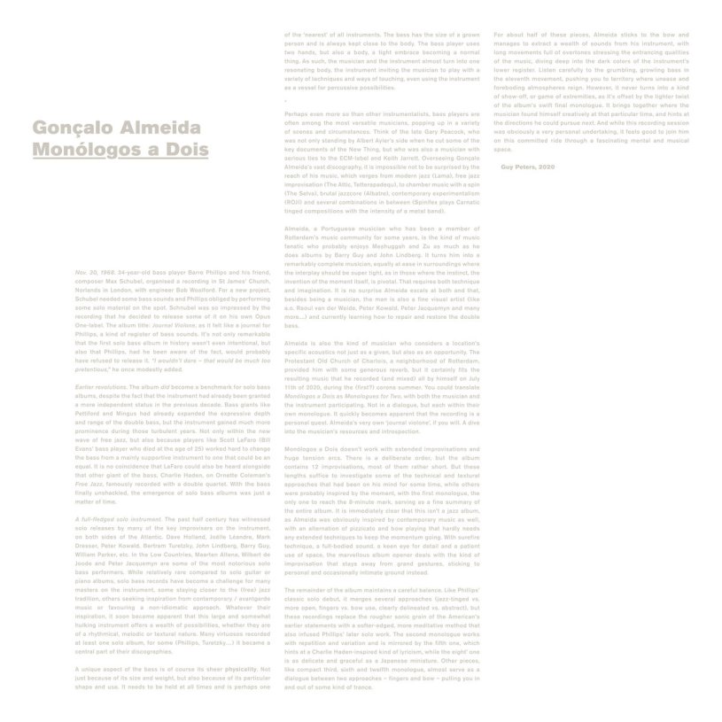 De Portugese bassist Gonçalo Almeida heeft Rotterdam als uitvalsbasis. Almeida is een bevlogen muzikant die zich thuis voelt in verschillende muzikale werelden en die zich geen beperkingen laat opleggen. Naast muzikant is de Portugees ook beeldend kunstenaar en labelbaas van het kleine DIY-platenlabel Cylinder Recordings. Zijn nieuwste album is echter verschenen bij het Belgische A New Wave of Jazz onder de titel Monólogos a Dois.