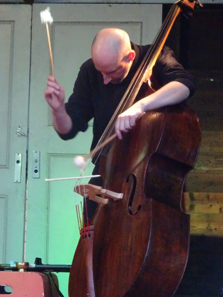 De tweede improvisatie is korter en wat dynamischer dan de eerste. Serries gebruikt een houten stokje om wat scherpere, pikkende klanken uit zijn instrument te halen. Mooi is het gedeelte waarin beide muzikanten tokkelend in de weer zijn. In het eerste stuk na de pauze beweegt Almeida zijn strijkstok over het hele instrument, niet alleen over de snaren, maar ook over het onderste gedeelte en zelfs over de steun waar het instrument op rust. Korte vegen (beiden), stuiterende hoge klanken (Almeida), wrijvende geluiden met een metalen voorwerp (Serries), het bespelen van de snaren met een brush (Almeida), zachtjes slaan op de klankkast (beiden): er valt niet alleen auditief wat te beleven maar ook visueel. Daarbij is er steeds focus en staan de niet gebruikelijke middelen ten dienste van de muziek, van de improvisatie waarin de muzikanten even last hebben van een storing in de geluidsinstallatie, die echter niet af kan doen aan de boeiende verrichtingen op het podium.