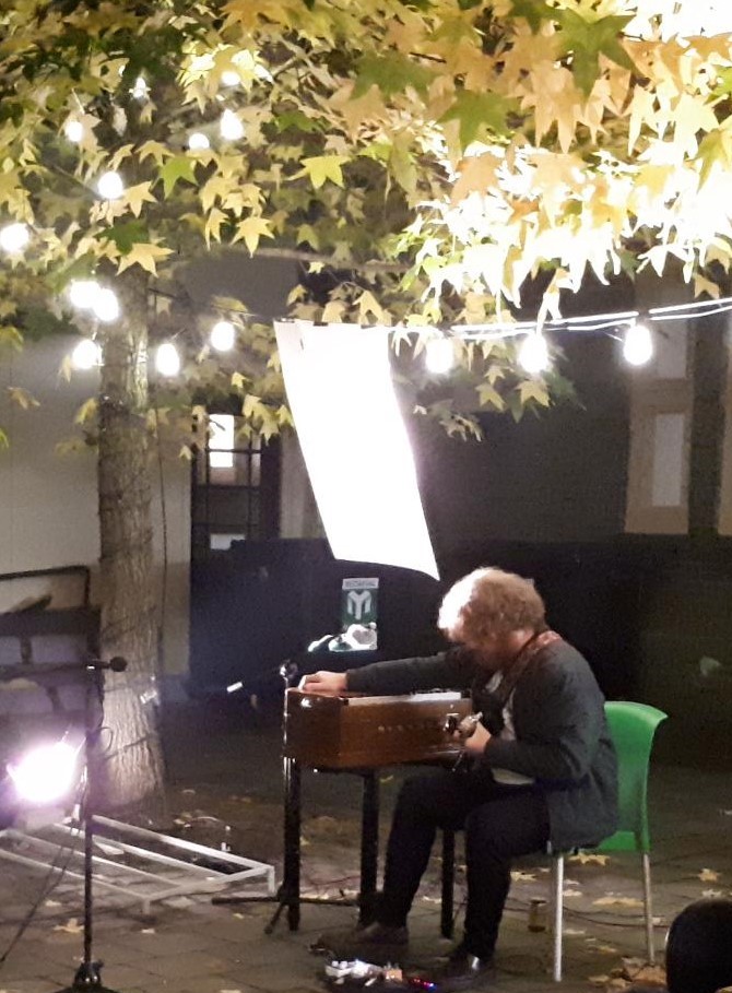 Het tweede concert in de openlucht is van R. (Robby) de Selby, bandlid van I Am Oak. Als solo-artiest tapt hij uit een wat ander vaatje. Het is buiten intussen aardig fris geworden, maar de kou lijkt geen vat te hebben op de muzikant, die zijn soundscape geconcentreerd brengt, slechts gewapend met een elektrische gitaar en een harmonium. Door gebruik van de beide instrumenten lijkt een resonerend effect op te treden, maar ook de klank van het harmonium zelf komt gaandeweg steeds duidelijker naar voren. De Selby bedient zich van een spaarzaam aantal noten, zijn gitaar bespelend met slechts één hand op de hals van het instrument, terwijl zijn andere hand gestaag pompend de lucht in het harmonium brengt.