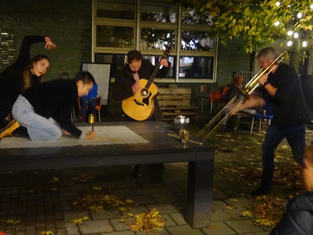 Je hoeft geen componist te zijn om een grafische partituur te kunnen maken. Tenminste niet als je Ying Joseph Liu heet. Dat is een kunstenaar die is gaan tekenen op muziekpapier, waarna verschillende muzikanten op basis van haar tekeningen zijn gaan musiceren. Het Utrechtse vrije improvisatieduo Lärmschutz (Stef Brans op gitaar en Rutger van Driel op trombone) deed dat al op het vorig jaar verschenen Wood & Tin III en vanavond wordt een zelfde soort werkwijze op het binnenplein van DUMS live getoond en ten gehore gebracht. Dat is nog niet alles, want behalve Brans, Van Driel en Liu is ook danseres Gabrielle Emily Aidulis van de partij. Op verschillende plekken hangen grote witte vellen papier en ook op de grote tafel ligt een groot stuk blanco papier, waar Liu haar graphic scores op tekent. Lärmschutz improviseert op basis van die scores en Aidulis danst op basis van de scores en de muziek.